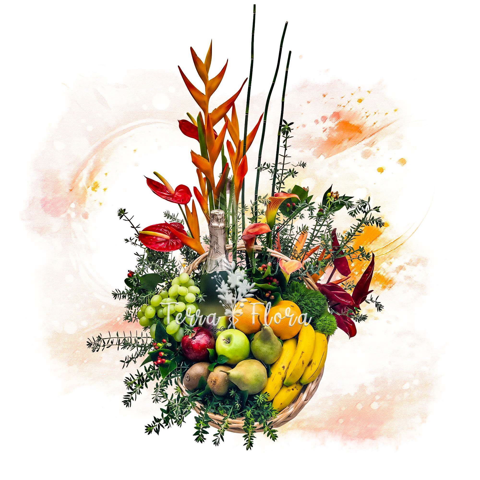 ARREGLO EXÓTICO CON FRUTA Y VINO